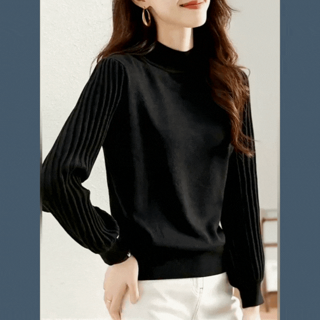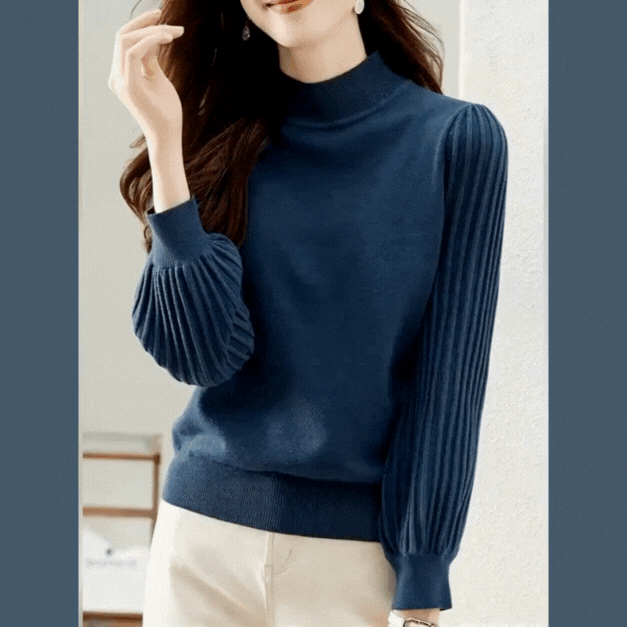 El Suéter Emma combina un corte clásico con detalles modernos: cuello alto elegante, mangas acanaladas con volumen y caída perfecta, todo en un tejido suave que abraza tu figura sin apretar.
